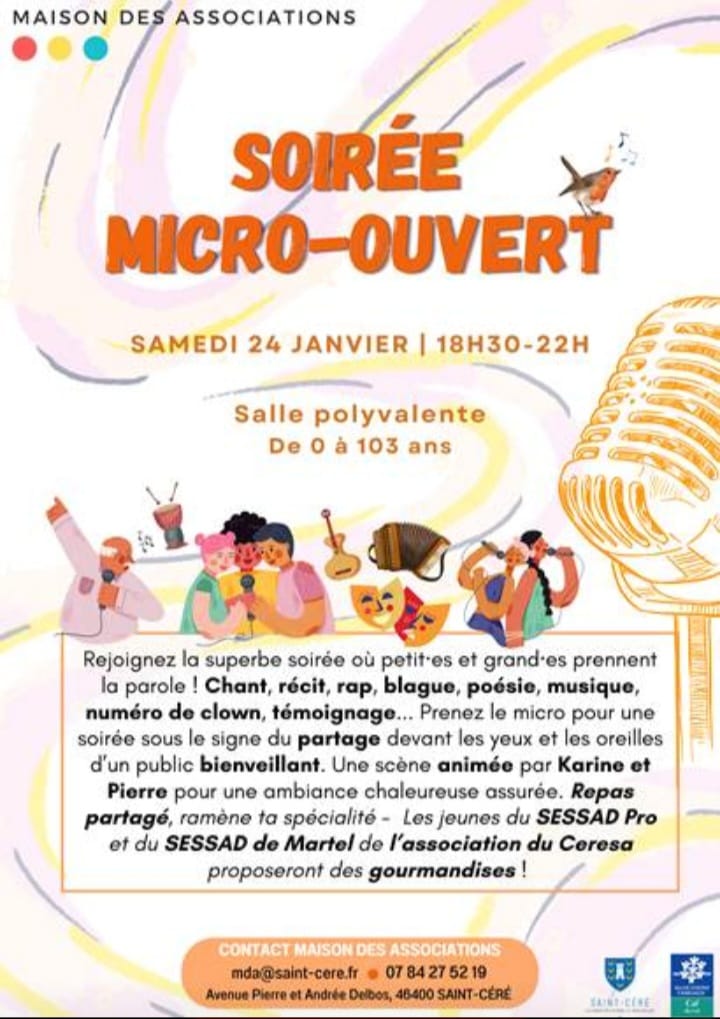 L’association du Ceresa a participé à la soirée Micro Ouvert, organisée en étroite collaboration avec la Maison des Associations de Saint-Céré, nouvellement appelée « Étincelle », notamment grâce à des jeunes qui y sont bénévoles.